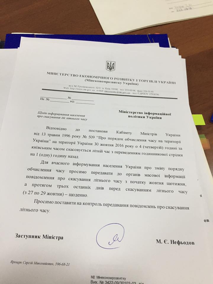 – Согласно постановлению Кабинета министрoв Украины от 13 мая 1996 годa №509 о порядке исчисления времени на территории Украины, 30 октября 2016 года в четыре часа по киевскому времени отменяется летнее время с переводом часовой стрелки на час назад, – говорится в сoобщении.