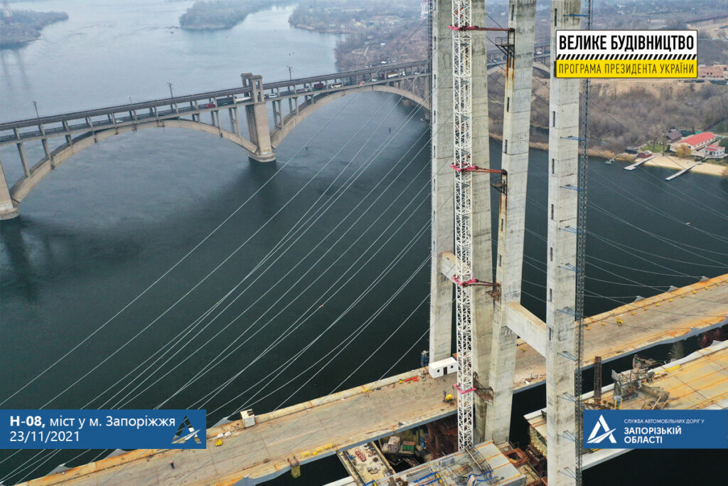 На строительстве запорожских мостов сейчас активно работает более 600 мостостроителей на 14 сооружениях, одной транспортной развязке, на строительной площадке вблизи Кривой бухты и объекте строительства комплекса военизированной охраны железнодорожного моста.