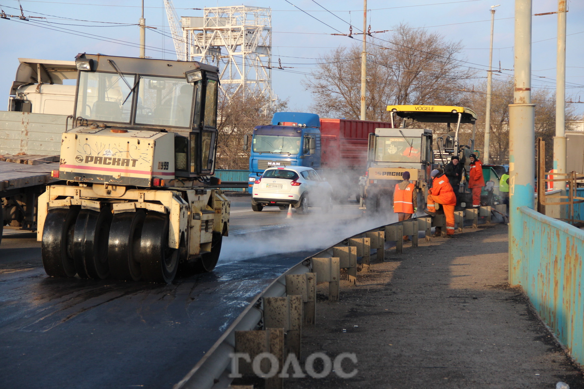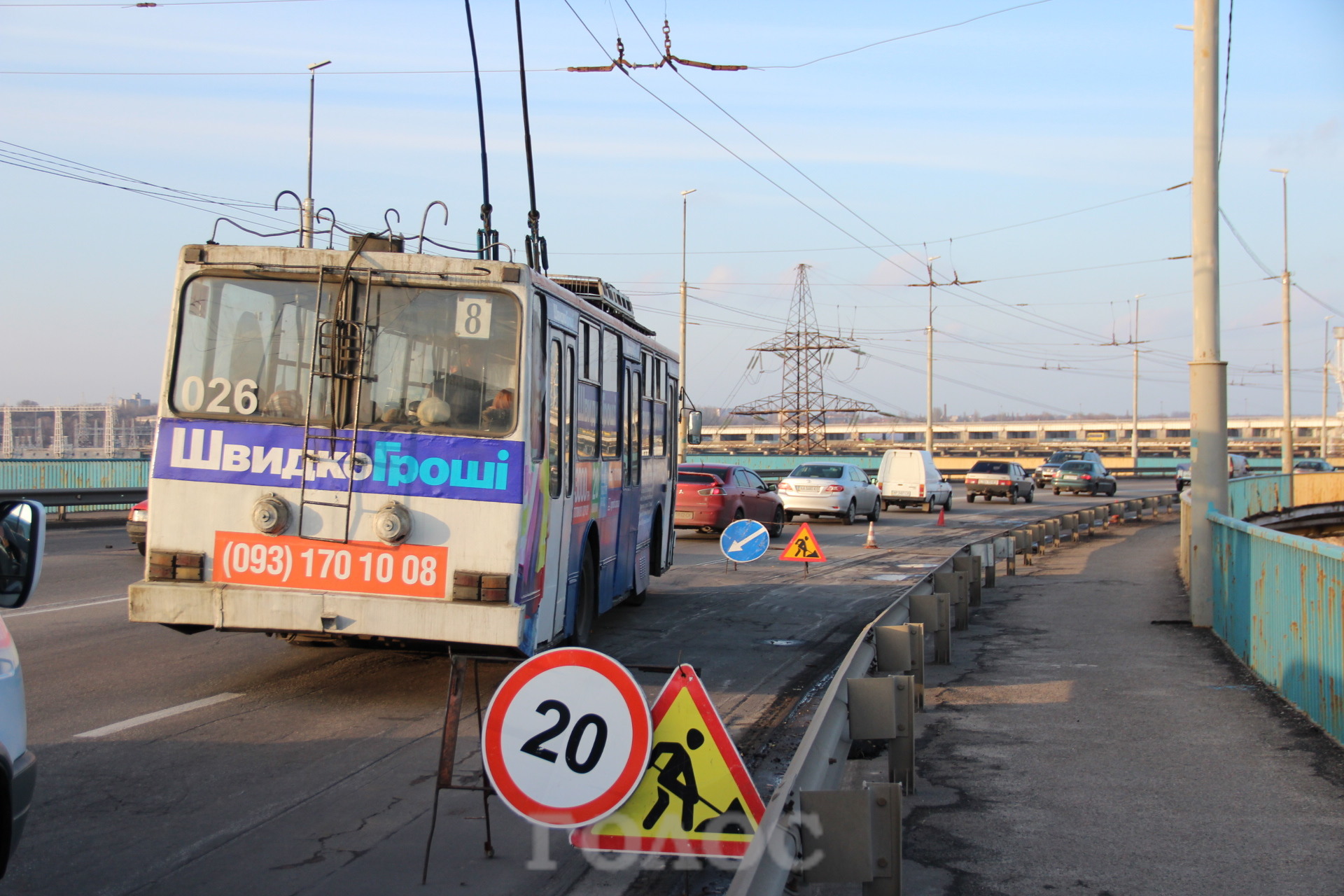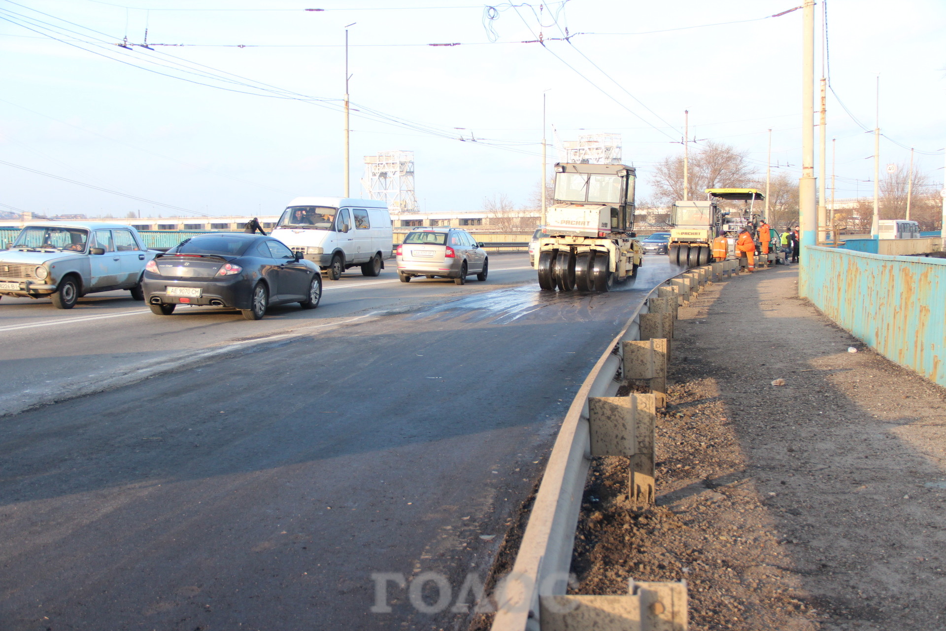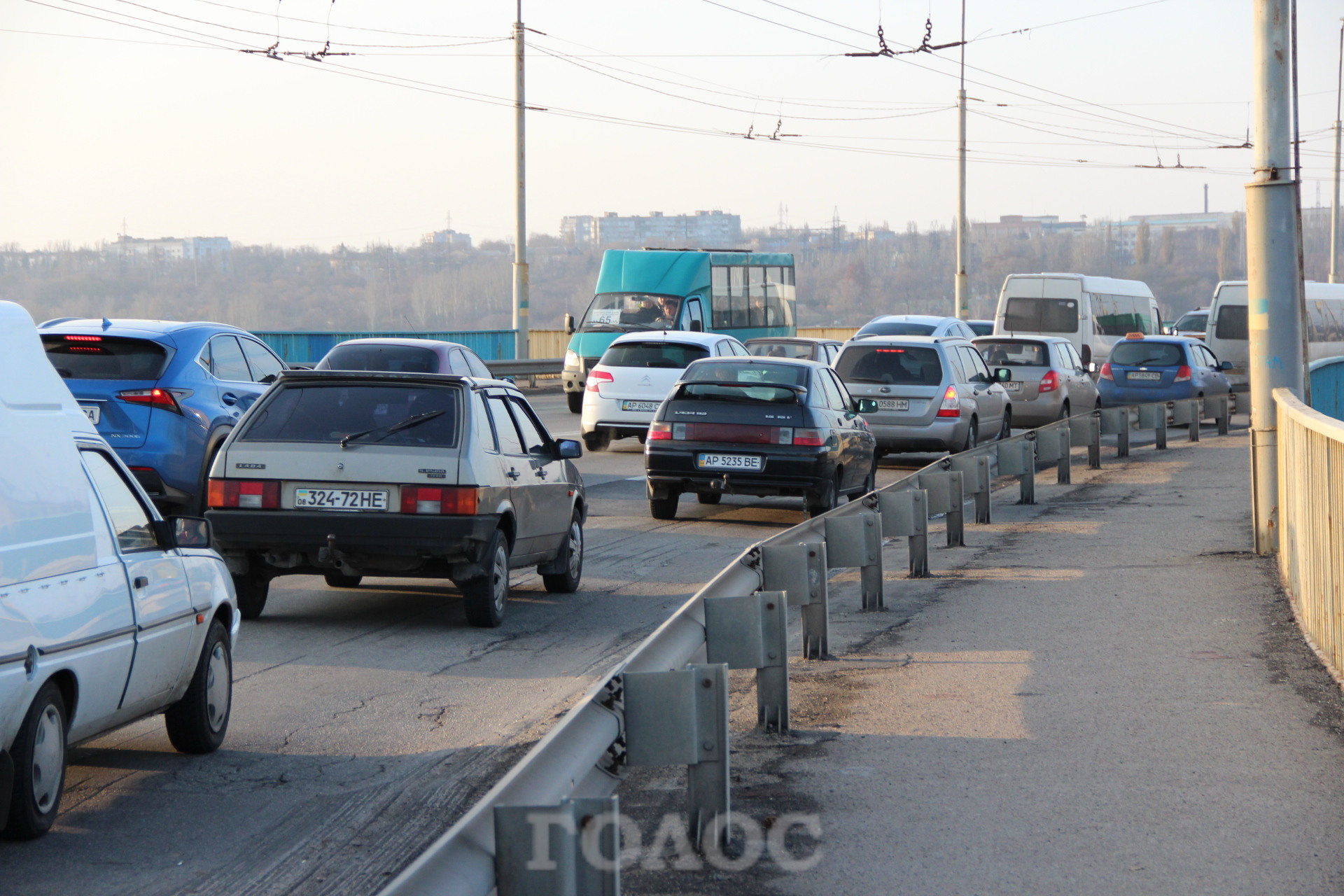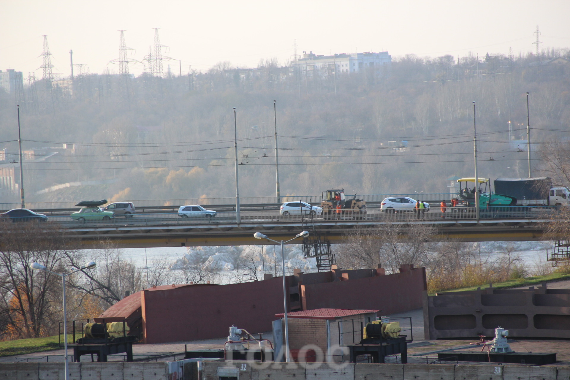 Сегодня, 11 ноября, на плотине ДнепроГЭСа снова образовалась пробка. На этот раз из-за проведения ремонтных работ дорожного покрытия.
