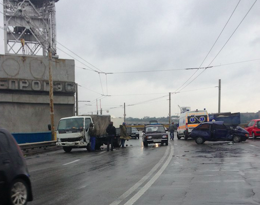 Около часа назад на плотине ДнепроГЭСа снова случилась дорожная авария. По словам очевидцев, легковой автомобиль «Таврия» на большой скорости влетел в грузовик.