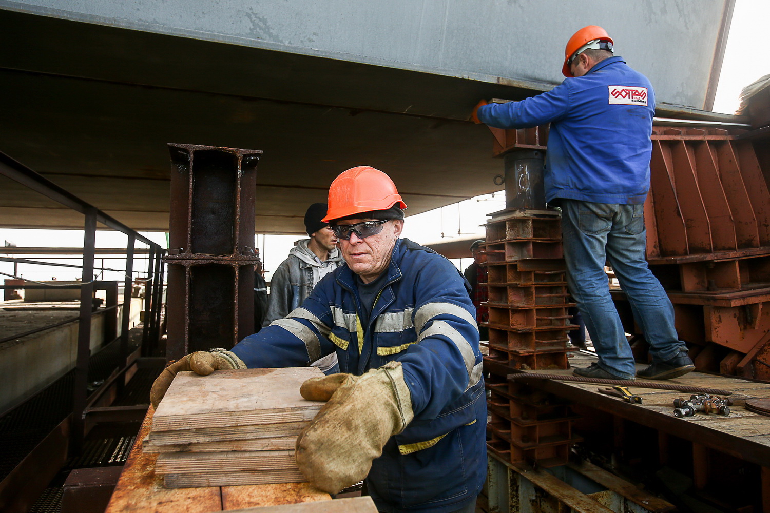 На строительстве пока задействованы 33 работника предприятия «Маст-Буд». До 3 октября подрядчики планируют надвинуть конструкцию на отметку 56 метров.
