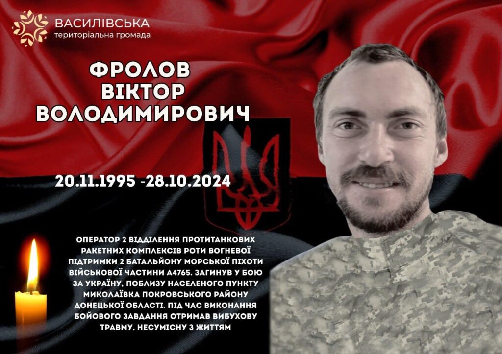 28 октября 2024 года возле села Николаевка Донецкой области 28-летний Виктор Фролов получил смертельную взрывную травму. Мужчина был матрос ВСУ, оператор отделения противотанковых ракетных комплексов.