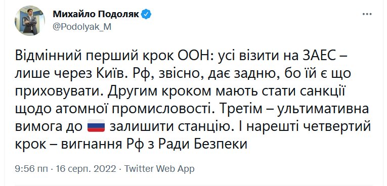 «Отличный первый шаг ООН: все визиты на ЗАЭС – только через Киев», – написал Подоляк.