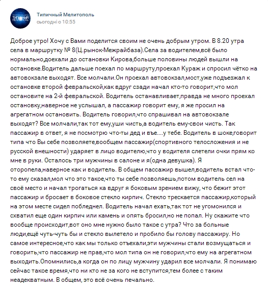 Сегодня, 28 октября, в Мелитополе местный житель напал на пожилого водителя общественного транспорта.