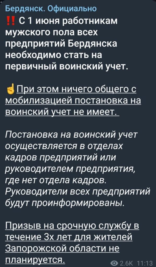 Согласно сообщению, всех мужчин, которые работают на бердянских предприятиях обязали стать на воинский учет. Российская пропаганда пишет, что, якобы, это не имеет ничего общего с мобилизацией и в течение трех лет не планируют призывать мужчин из Запорожской области на срочную службу.