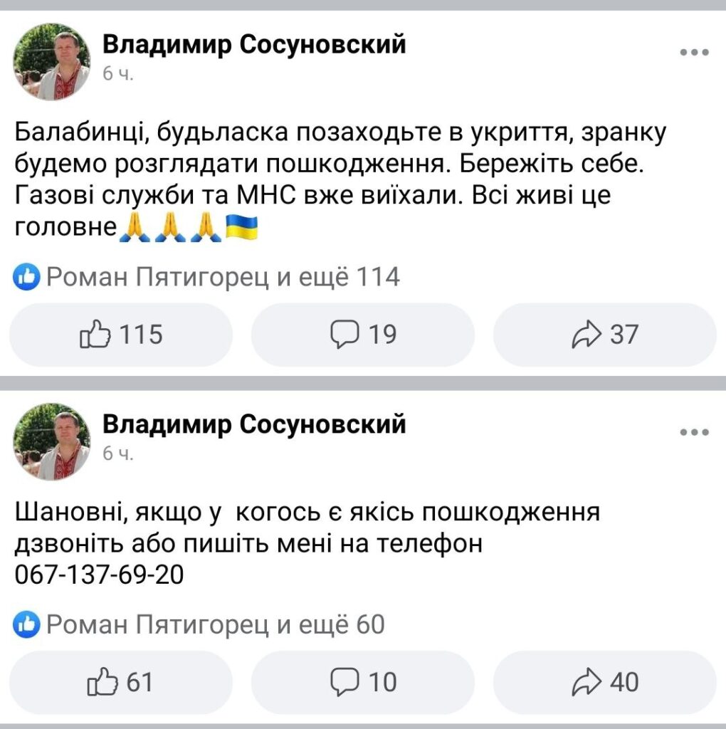 К счастью, жертв среди мирного населения нет. О полученных повреждениях в результате вражеской атаки Владимир Сосуновский попросил сообщать его лично по тел: 067-137-69-20.