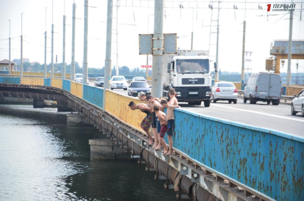 Дети перелезли через ограждение и прыгали с моста ДнепроГЭСа. Их не останавило то, что купаться в этом месте строго запрещено, а тем более прыгать в воду.