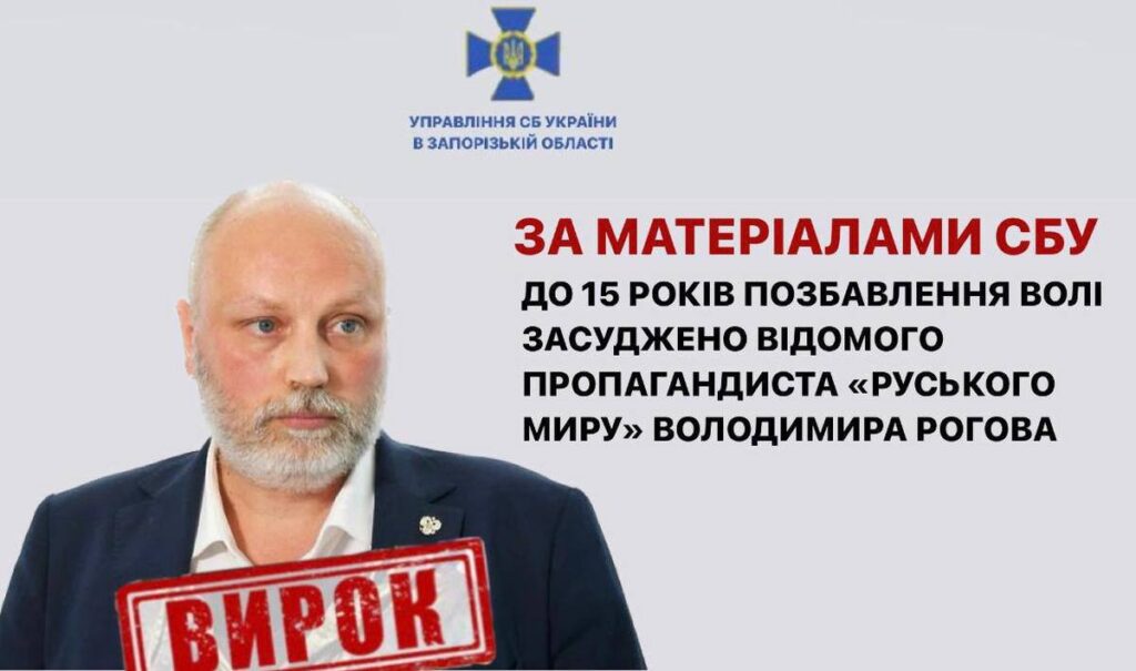 Коллаборанта и сторонника «русского мира» Владимира Рогова приговорили к 15 годам лишения свободы с конфискацией всего имущества и лишением права занимать какие-либо должности в органах государственной власти сроком на 15 лет. Его признали виновным в государственной измене и передаче материальных ресурсов вооруженным формированием государства-агрессора, согласно ч. 2 ст. 111, ч. 1 ст. 111-2 Уголовного кодекса Украины.