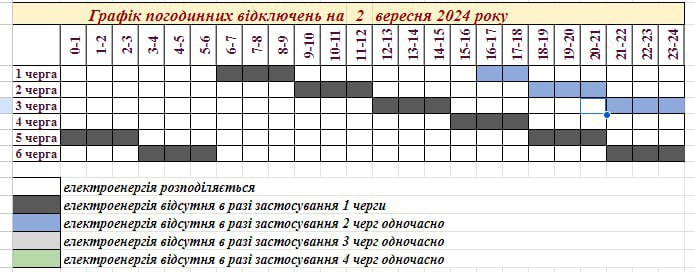 В соответствии с полученным от НЭК «Укрэнерго» заданием график почасовых отключений по Запорожской области на 2 сентября выглядит следующим образом: с 16:00 до 24:00 – будут выключать одновременно две очереди, остальные сутки – с 00:00 до 16:00 – одну очередь.