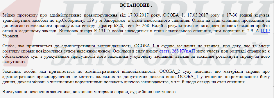 Инцидент произошел 17 марта этого года, на проспекте Соборном, 149. Патрульные остановили автомобиль Ford Fiesta, водитель которого находился в состоянии алкогольного опьянения. Это подтверждают результаты алкотестера Drager. Водитель не согласился с таким результатом и пожелал пройти осмотр в медицинском учреждении. Но и тут ему не повезло: нарколог также подтвердил, что норма алкоголя в крови несколько завышена.
