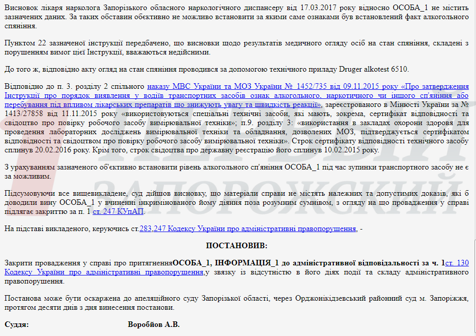 По такой же схеме защита нивелировала заключение врача-нарколога Запорожского областного наркологического диспансера, заявив, что в этом документе не указано время проведения экспертизы и технические средства, на котором оно проводилось, дата последней проверки и сам результат.