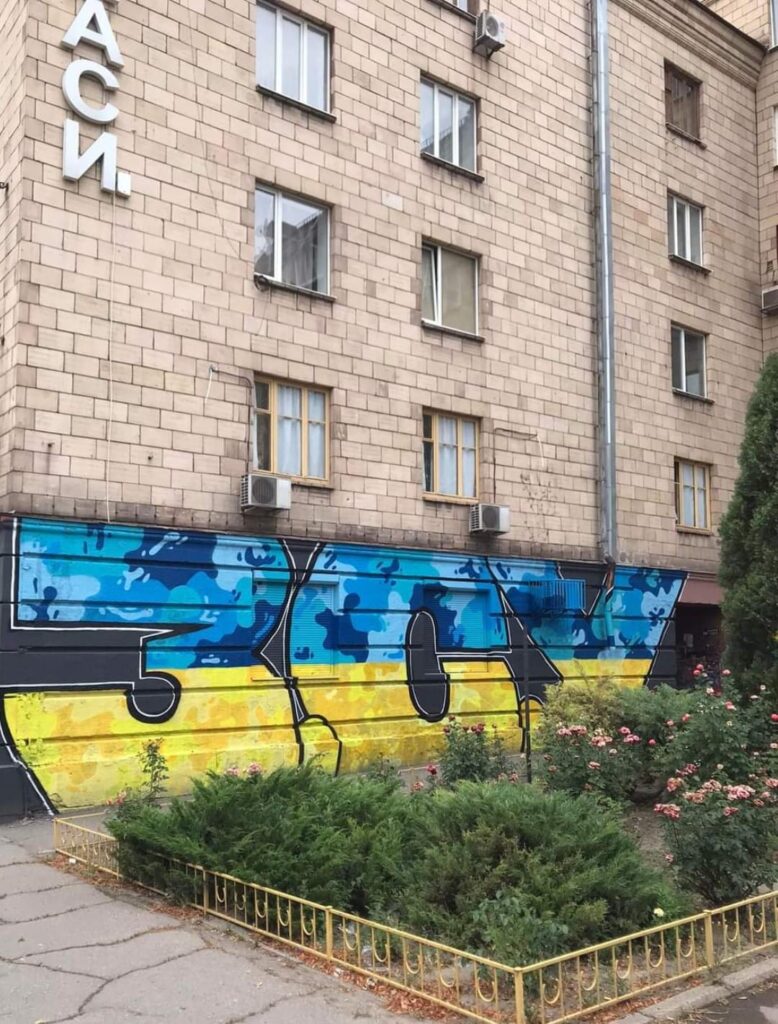 Также талантливый художник Денис Липтон на домах в Вознесеновском районе изобразил боевого голубя и патриотическую надпись в поддержку героев из ВСУ.