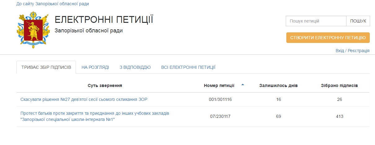 Аналогичный сайт с петициями создали на сайте Запорожского областного совета, после принятия депутатами соответствующего решения еще в феврале прошлого года. В тестовом режиме сайт начал работать с 01.10 2016 по 12.12.2016 года. За это время запорожцы подали всего лишь две петиции –об отмене решения №27 областного совета по защите института семьи в Украине и о протесте реорганизации интерната №1.