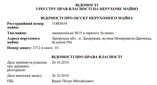Согласно декларации, из недвижимости в собственности у Петра Ваната есть только одна квартира площадью 165 квадратных метров и стоимостью 453 тысячи гривен, а также машиноместо на парковке дома на 18 кв. метров.