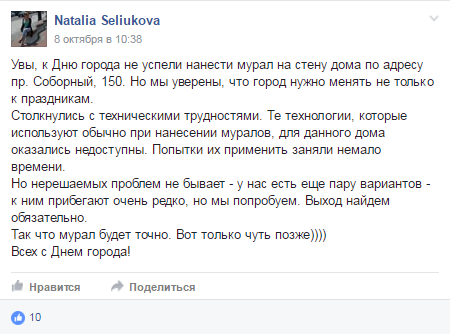 На официальной странице проекта «Современный город» в соцсети Facebook его куратор Наталья Селюкова рассказала о том, почему ко Дню города не успели нанести мурал на стену дома по адресу пр. Соборный, 150.
