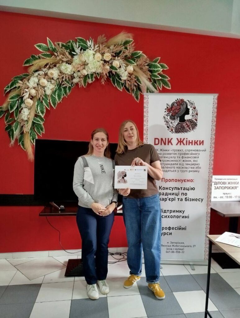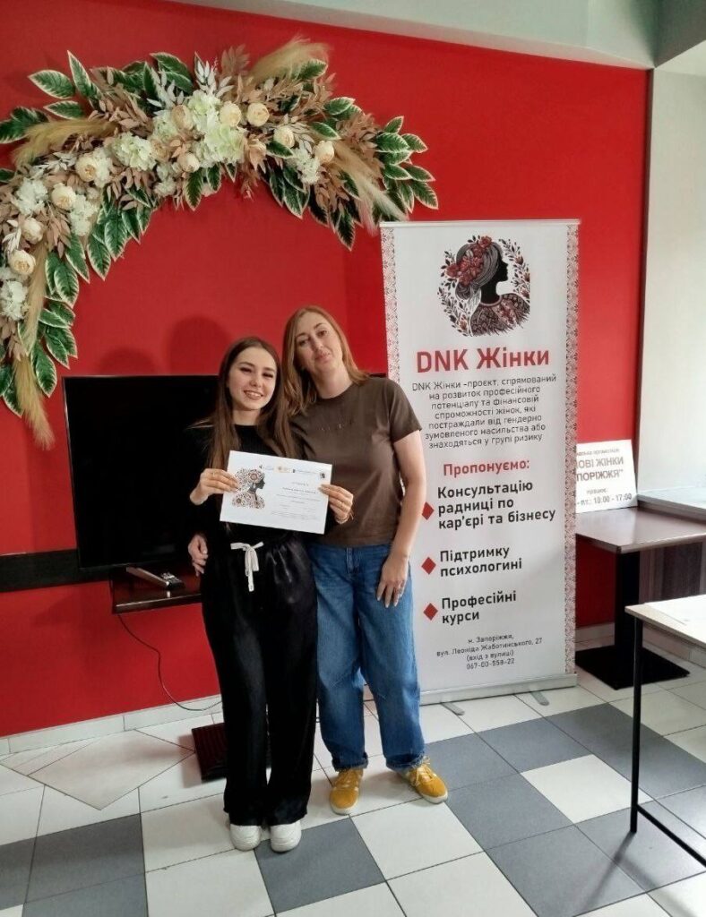 Хаб «ДНК женщины», расположенный в большом помещении площадью 155 квадратных метров в центре города, является полностью обустроенным пространством, в котором есть залы для проведения тренингов и обучения, а также специализированные рабочие зоны. В хабе есть кабинеты для освоения востребованных профессий в сфере красоты (мастеры маникюра и педикюра, парикмахерского дела, ухода за бровями), оборудованные всем необходимым для работы. Такая практика позволяет женщинам приобрести и закрепить навыки, помогающие им стать финансово независимыми и уверенными в себе, делится глава общественной организации «Деловые женщины Запорожья» Ирина Полиектова. Более того, в организации бесплатно предоставляют участницам это пространство для работы с их первыми клиентами. Потому что после обучения нужно закрепить эти навыки и начать работу, пока не сформируют клиентскую базу и не смогут самостоятельно арендовать рабочее место.