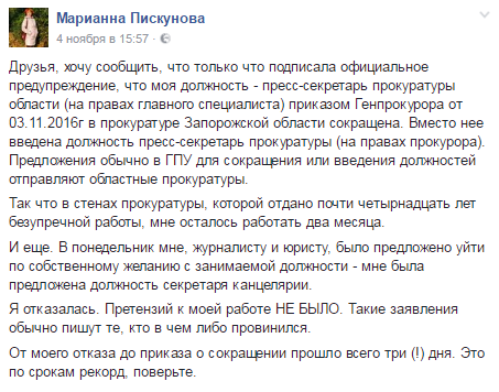 Также она отметила, что приказом Генпрокурора от 3 ноября 2016 года должность «пресс-секретарь прокуратуры области» (на правах главного специалиста) в прокуратуре Запорожской области сокращена. Вместо нее введена должность «пресс-секретарь прокуратуры» (на правах прокурора). Обычно предложения в ГПУ для сокращения или введения должностей отправляют областные прокуратуры.