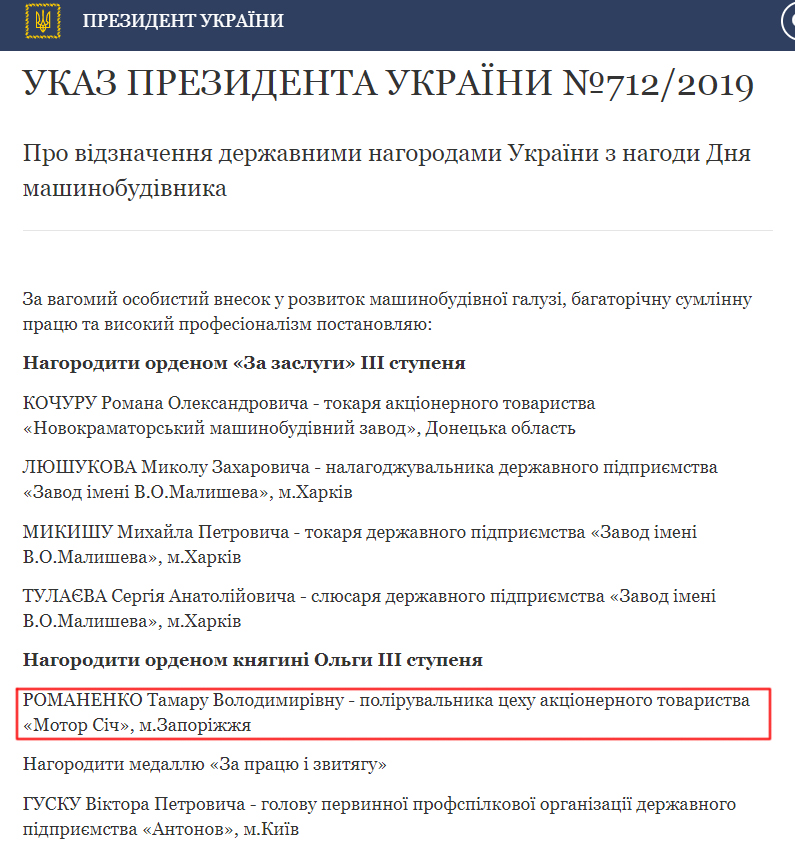 Президент Украины наградил сотрудников завода «Мотор Сич». Соответствующий Указ опубликован на официальном сайте президента страны.