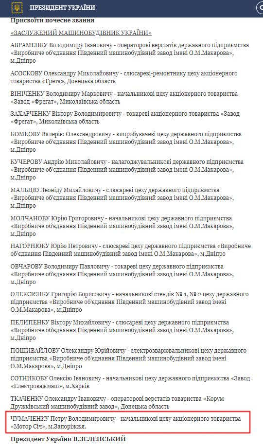 Этим же Указом присвоено почетное звание «Заслуженный машиностроитель Украины» начальнику цеха Петру Чумаченко.