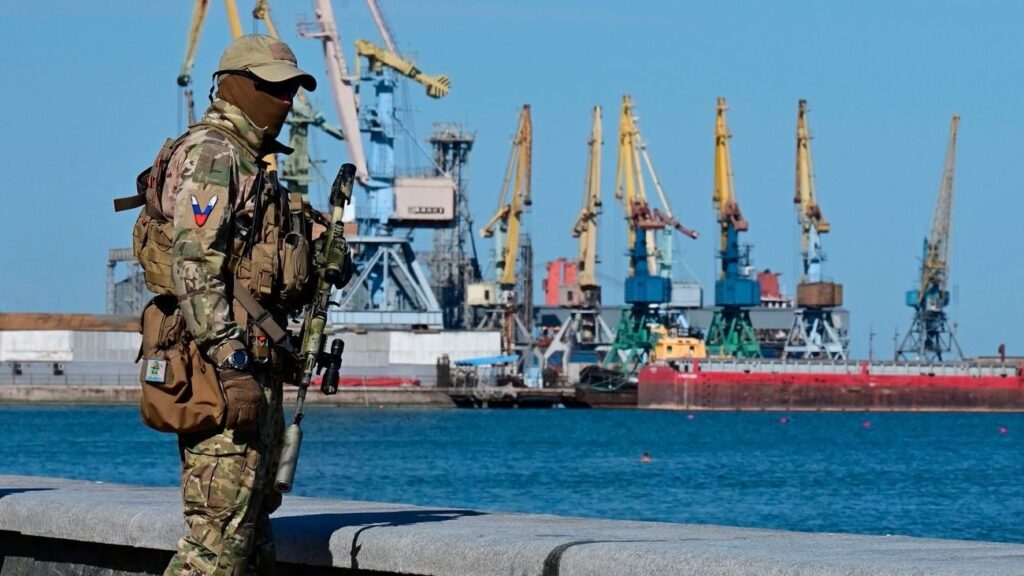По словам местных жителей, в марте в порт зашли сторожевые корабли без опознавательных знаков, а под российским конвоем было выведено пять иностранных судов с захваченным украинским зерном. С тех пор порт используется для вывоза ресурсов и поставки техники, боеприпасов и личного состава.