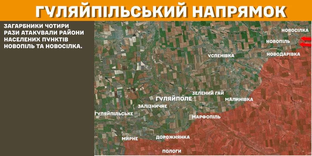На Гуляйпольском направлении захватчики четыре раза атаковали районы населенных пунктов Новополь и Новоселка.