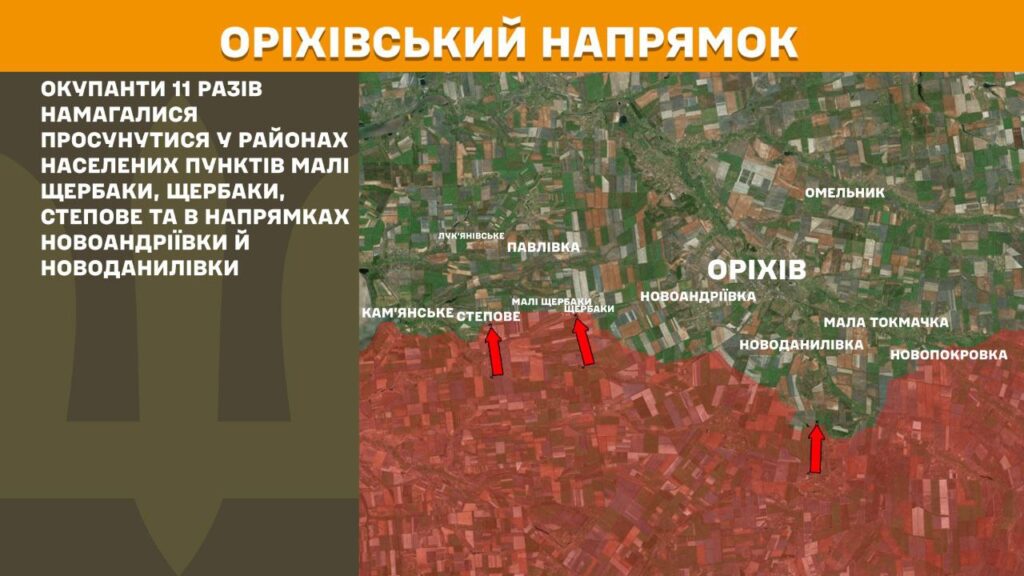 На Ореховском направлении оккупанты одиннадцать раз пытались продвинуться в районах населенных пунктов Малые Щербаки, Щербаки, Степовое и в направлениях Новоандреевки и Новоданиловки Запорожской области.