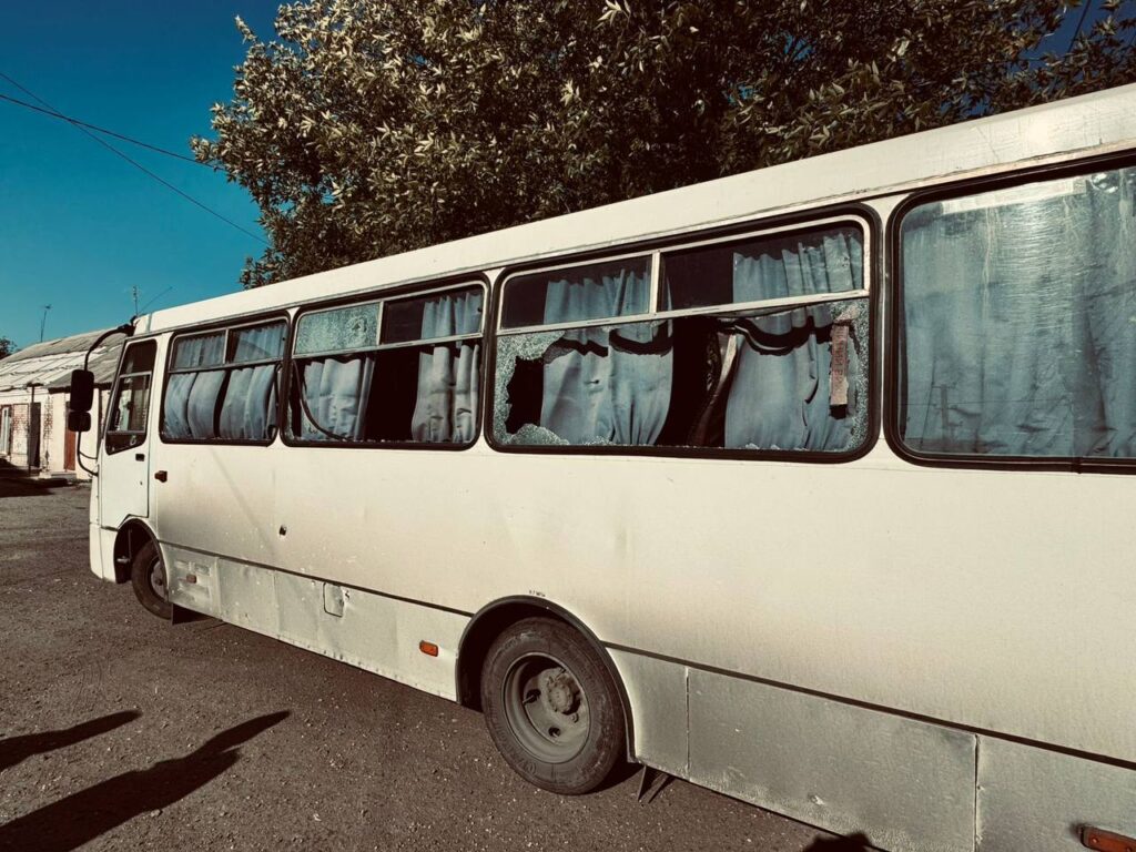 В результате российского удара поврежден бок автомобиля. Кроме того, выбиты окна в общественном транспорте. К счастью, никто из людей не пострадал.