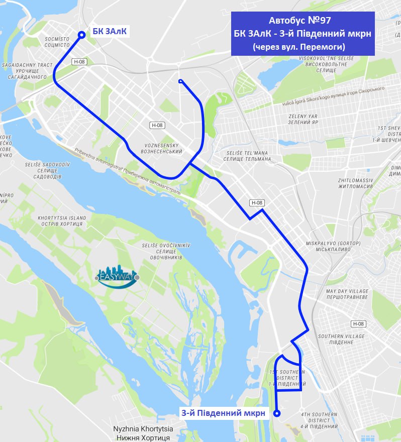 Автобус №97 будет курсировать: БК ЗАлК — ул. Победы – ул. Школьная – пр. Соборный – ул. В.Украинца – 3-й Южный мкрн. В обратном направлении: 3-й Южный мкрн – ул. Автозаводская – пр. Соборный – ул. Школьная – ул. Победы – ул. Седова – ул. Победы – БК ЗАлК. Стоимость проезда – 15 гривен.