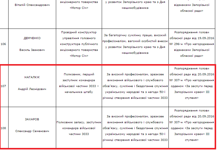 Григорий Самардак отметил наградой «За заслуги перед Запорожским краем» ІІІ степени» двух полковников: первого заместителя командира воинской части 3033 — начальника штаба Андрея Нагалюка и полковник запаса, заместителя командира воинской части 3033 Александра Захарова.