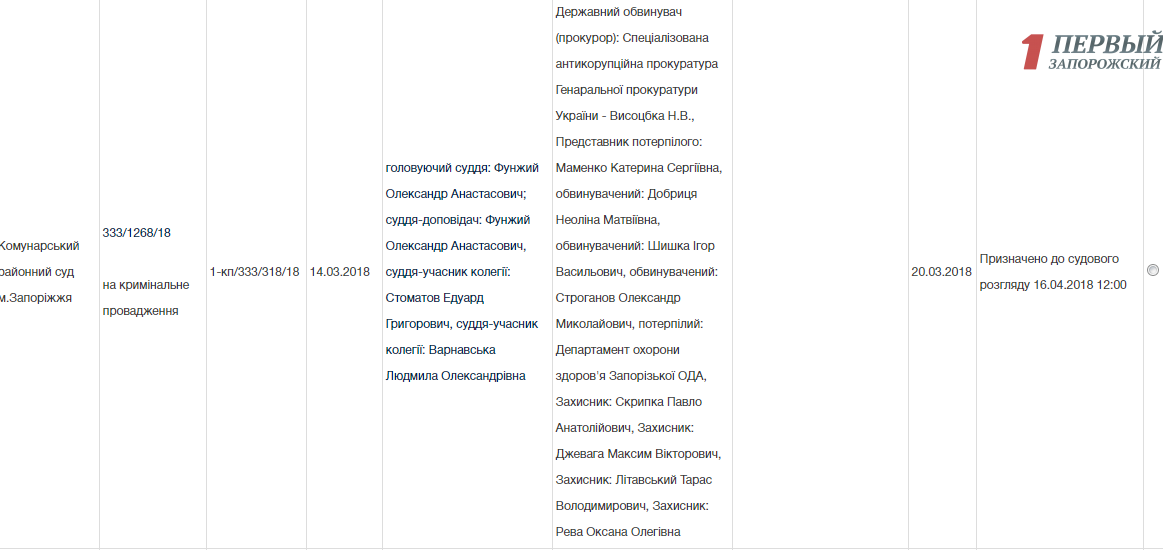 Одновременно с этим, судебное рассмотрение основного дела по подозрению в злоупотреблению служебным положением Игорем Шишкой и его подопечными, что повлекло нанесение ущерба государству в 13 миллионов гривен, начнется уже 16 апреля. Рассматривать дело будет в Запорожье коллегия судей Коммунарского районного суда во главе с судьей Александром Фунжий.