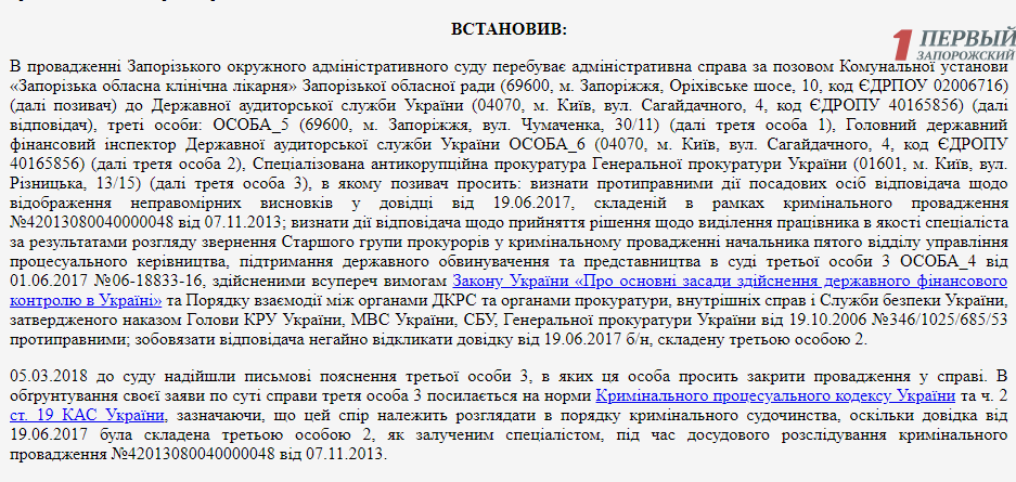 САП просит суд закрыть дело об иске Запорожской облбольницы против Госаудитслужбы