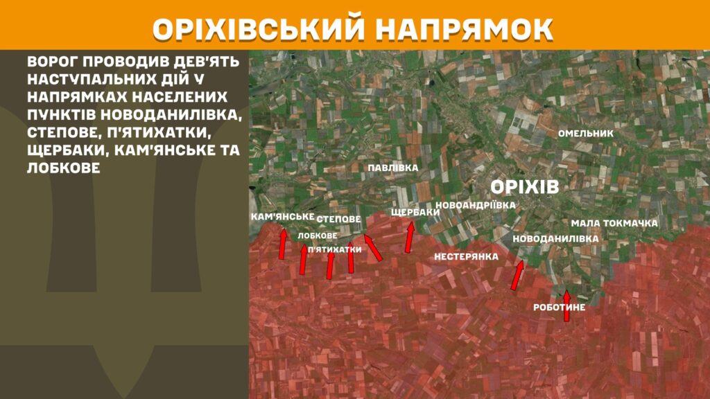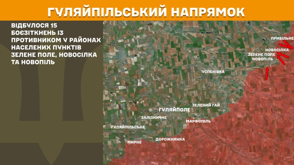 На Гуляйпольском направлении произошло 15 боестолкновений с противником в районах населенных пунктов Зеленое Поле, Новоселка и Новополь. На Ореховском направлении враг проводил девять наступательных действий в направлениях населенных пунктов Новоданиловка, Степовое, Пятихатки, Щербаки, Каменское и Лобковое.