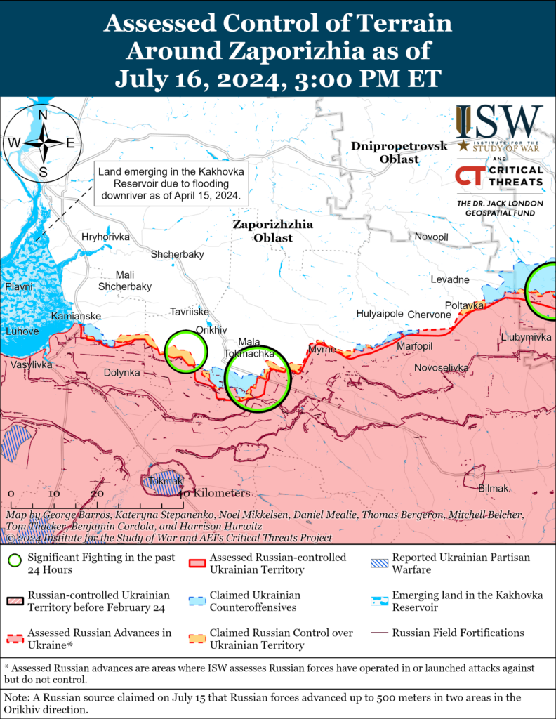 Бои продолжались 15 и 16 июля на западе Запорожской области в районе Работино, Малой Токмачки и Новоандреевки, но никаких подтвержденных изменений на линии фронта не было.