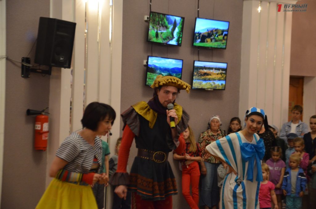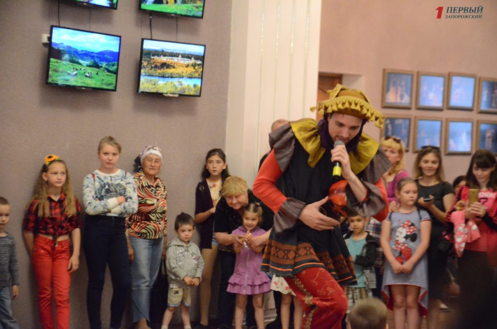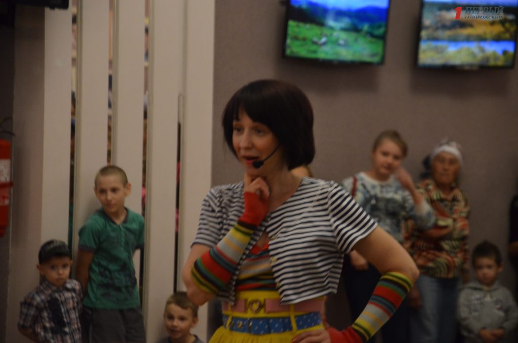 В холле заведения маленьким запорожцам устроили веселые конкурсы с подвижными танцами и играми. Дети с радостью развлекались с актерами театра.