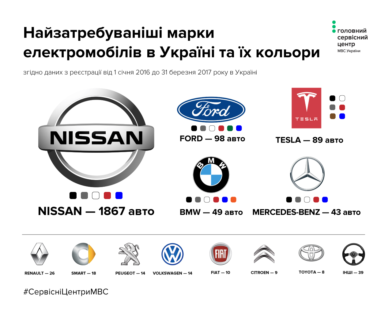 На украинском рынке лидируют электрокары «Nissan» (1867 штук, более 80%). Показатели других марок гораздо скромнее. Второе место в рейтинге популярности занимает «Ford» (98 авто), а третье – «Tesla» (89). В Топ-5 лидеров рынка также «BMW» (49 электрокаров) и «Mercedes-Benz» (43).
