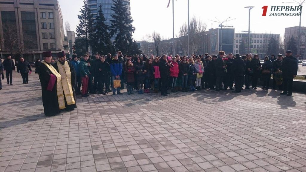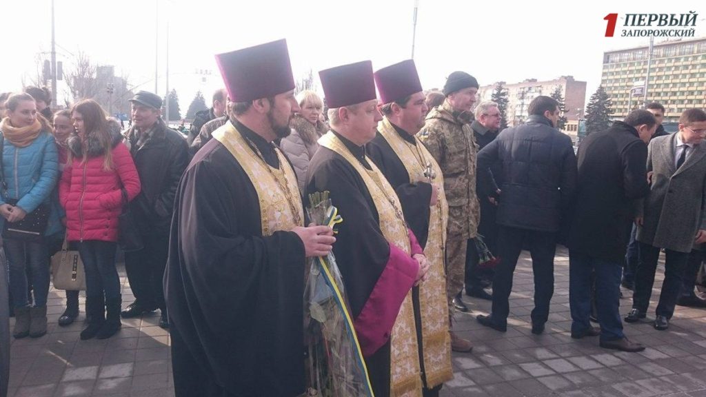 Представители конфессий провели молебен в память о погибших Героях, а все неравнодушные запорожцы возложили цветы к памятному знаку Героям Революции Достоинства.