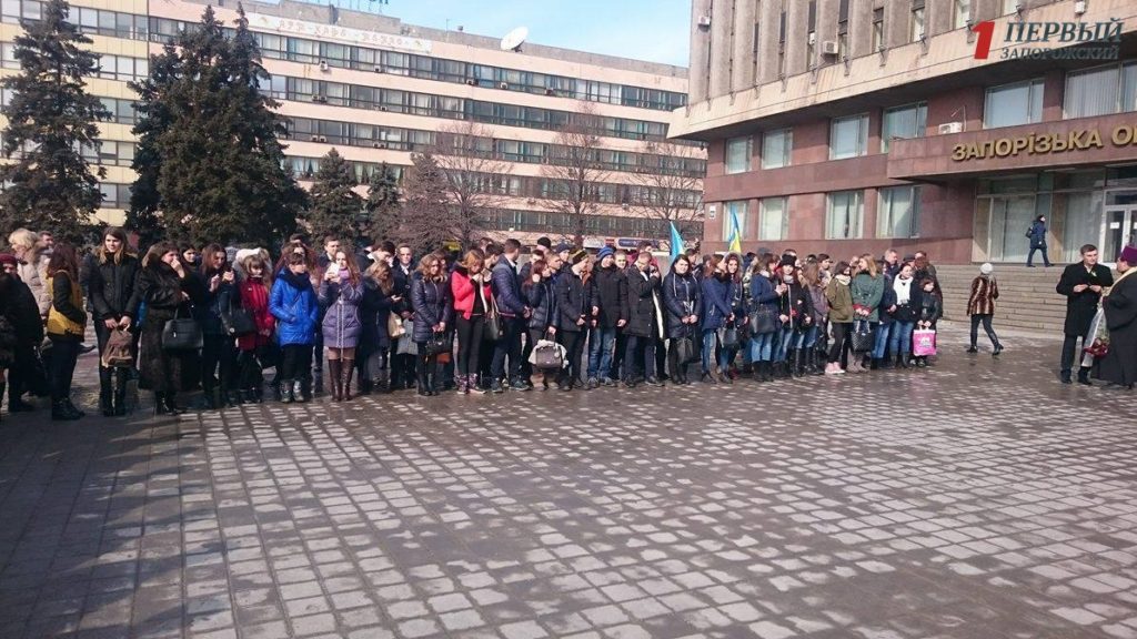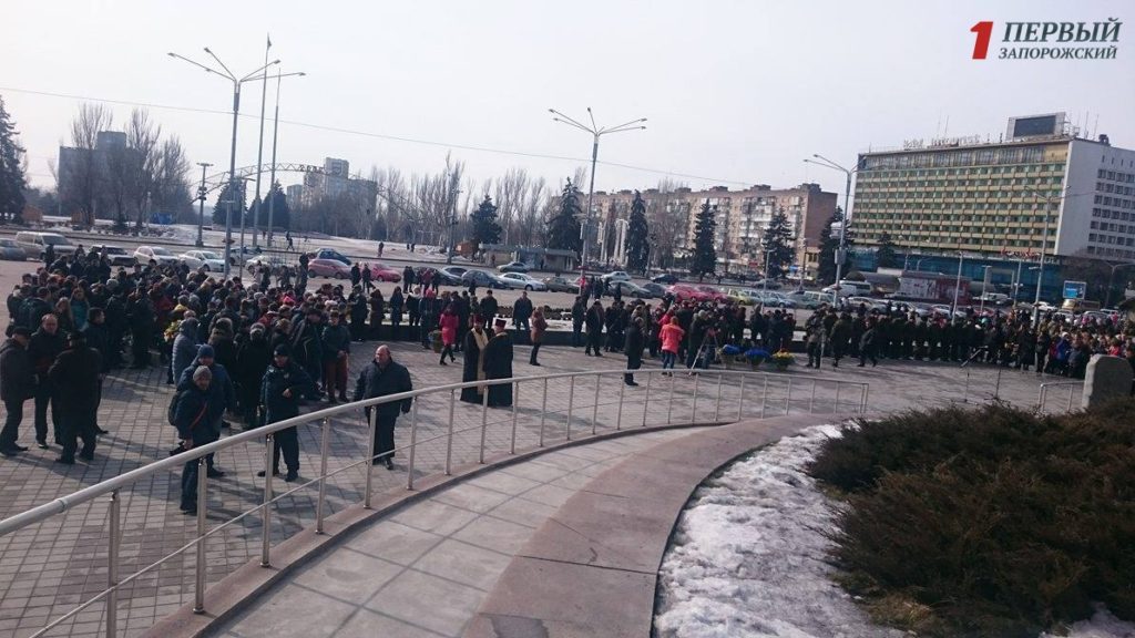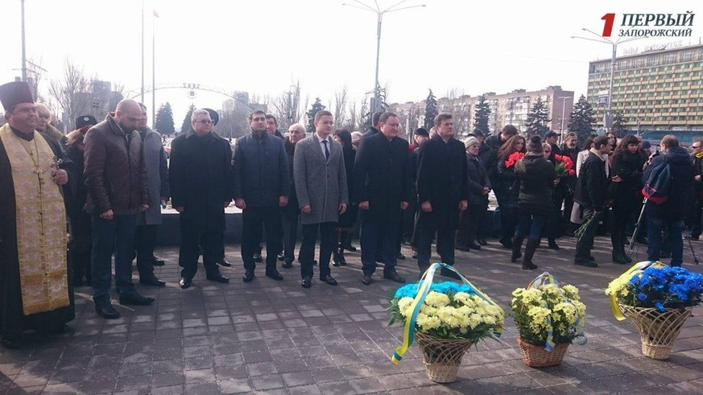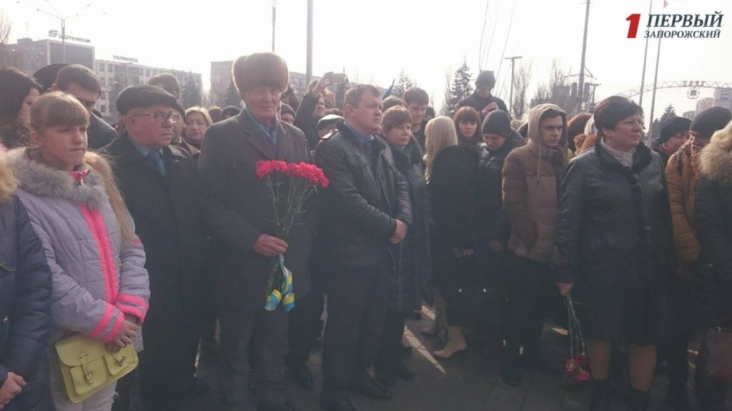 В полдень перед зданием ОГА собрались сотни запорожцев — представители власти, бизнесмены, студенты, военные, волонтеры и общественные активисты, чтобы вместе почтить память тех, кто отдал жизнь на Революции Достоинства.