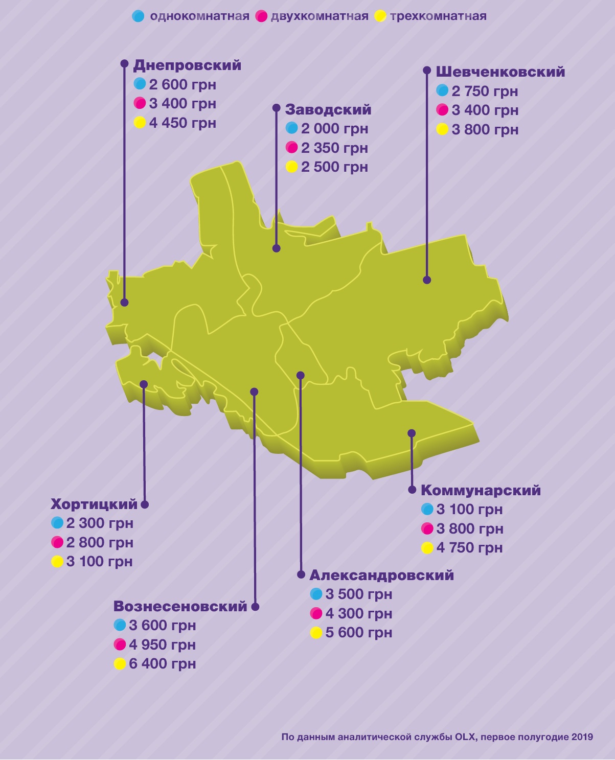 Традиционно самые дорогие квартиры Запорожья находятся в Вознесенском районе. Здесь стоимость трехкомнатного жилья составляет в среднем 6 400 гривен. За такую же сумму можно арендовать, например, две квартиры — «однушку» в Днепровском и «трешку» в Шевченковском.