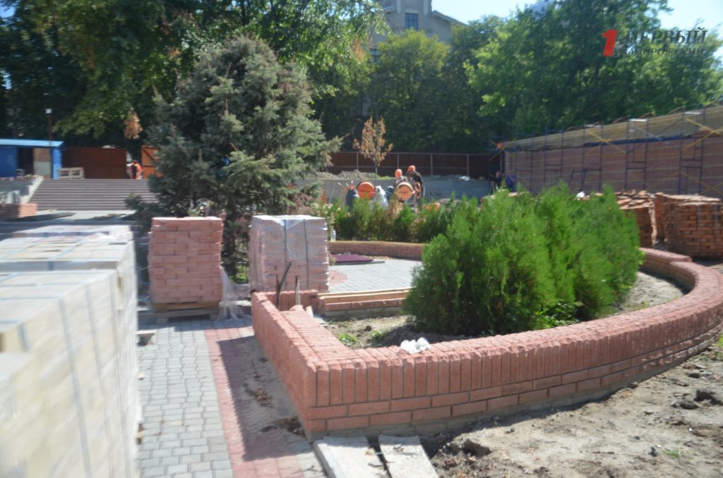 Высота между верхней и нижней частью сквера Театрального, от проспекта Соборного до улицы Александровской, составляет порядка пяти метров. Именно поэтому планировщики решили сделать сквер четырехуровневым, со своеобразными террасами и пандусами для людей с ограниченными возможностями. После проведения земляных и бетонных работ, подрядчик стал выкладывать цветную плитку и заканчивает обустройство ступенек из гранитных плит.