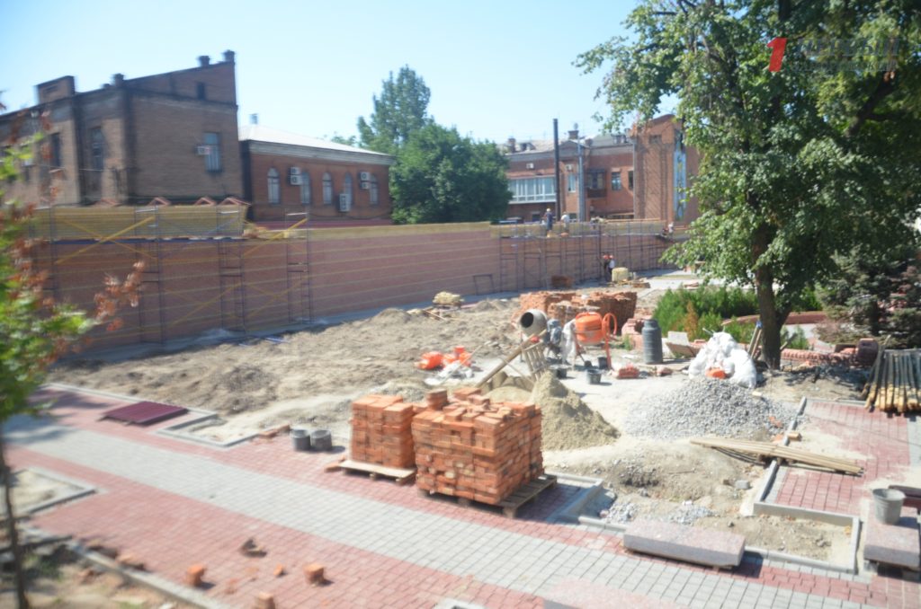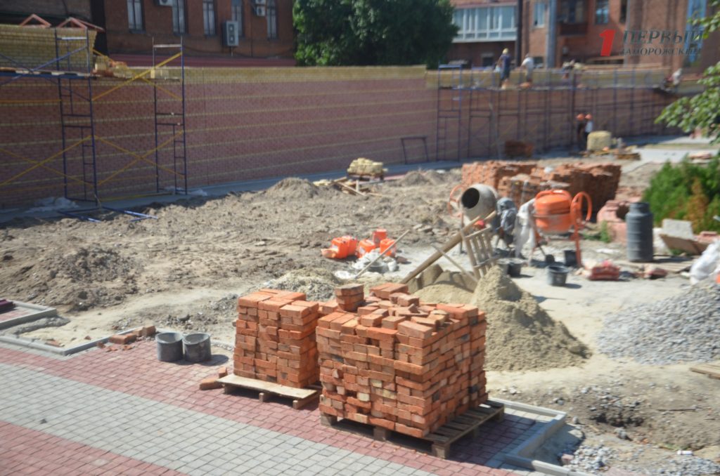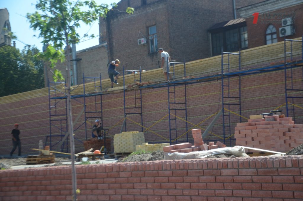 Параллельно строители завершают трудится над возведением подпорной стену в бежево-розовых тонах, которая укрепит фундамент исторического дома Лещинского, который расположен по соседству со сквером. Кроме этого данная стена закроет гаражи и заборы, которые находятся со стороны жилых домов в старой части города.