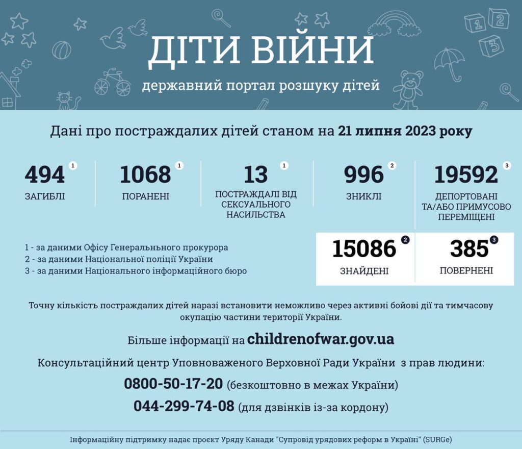 В результате полномасштабной вооруженной агрессии России пострадало более 1562 детей в Украине. За почти полтора года погибло 494 ребенка из-за вооруженной агрессии РФ.