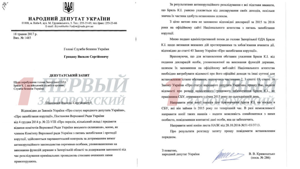 Для того, чтобы выяснить, какую должность все-таки занимал Брыль и правомерно ли он отказывается обнародовать декларацию за 2015 год, Кривохатько подал депутатский запрос через главу Верховной Рады Украины. В этом запросе нардеп потребовал раскрыть должность Константина Брыля, обнародовать приказ о его назначении и объем денежного обеспечения (помесячно) в органах СБУ с января 2015 года по 23 мая 2017 года.
