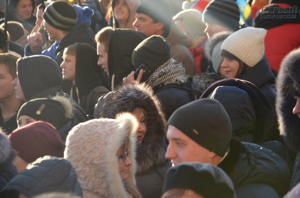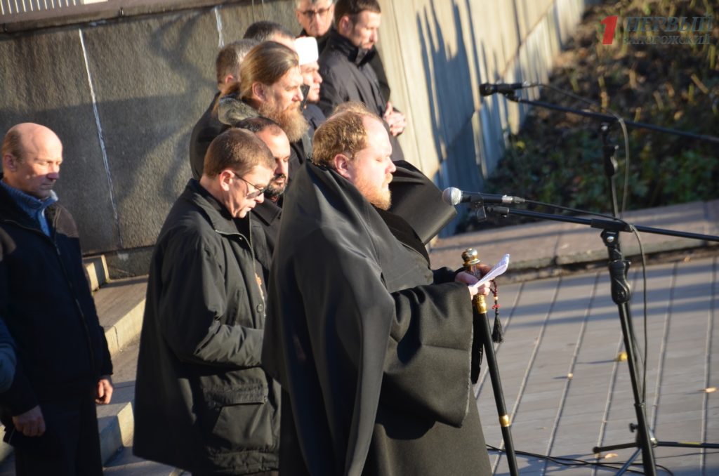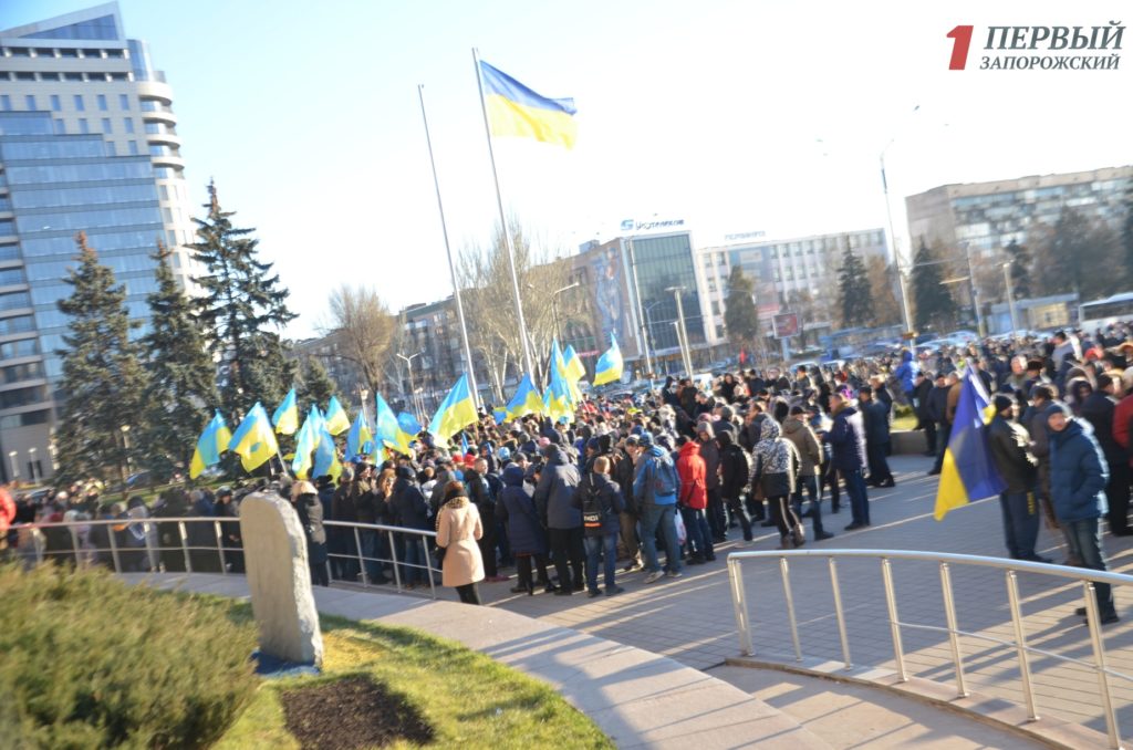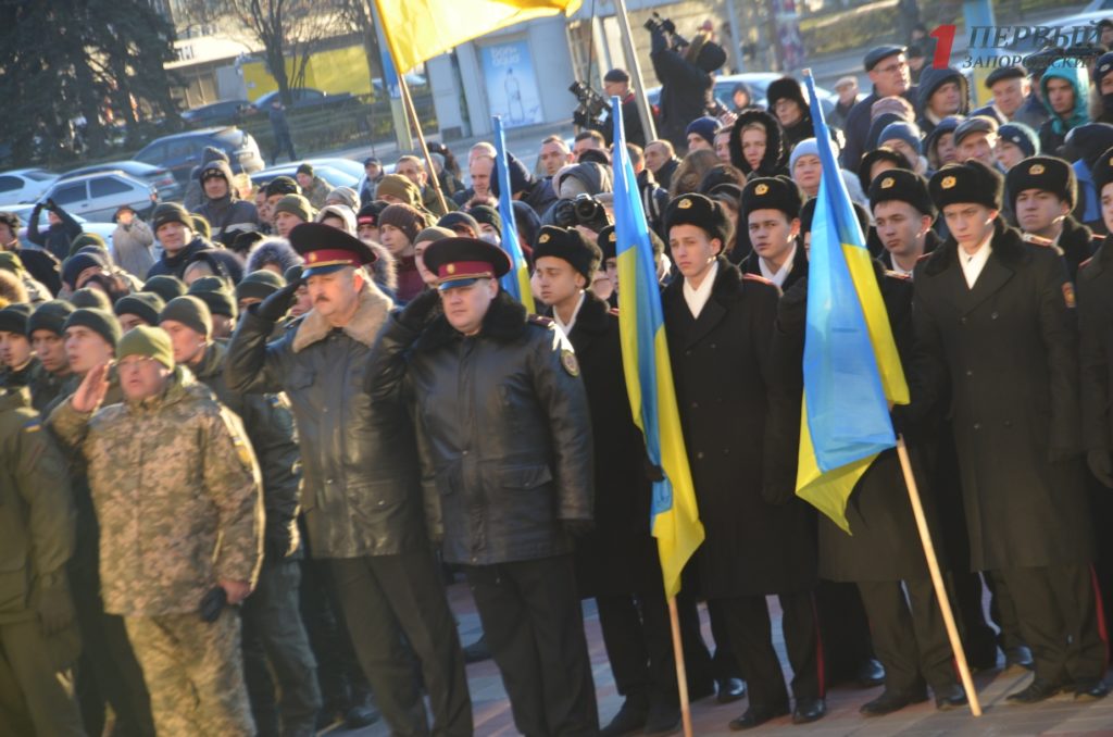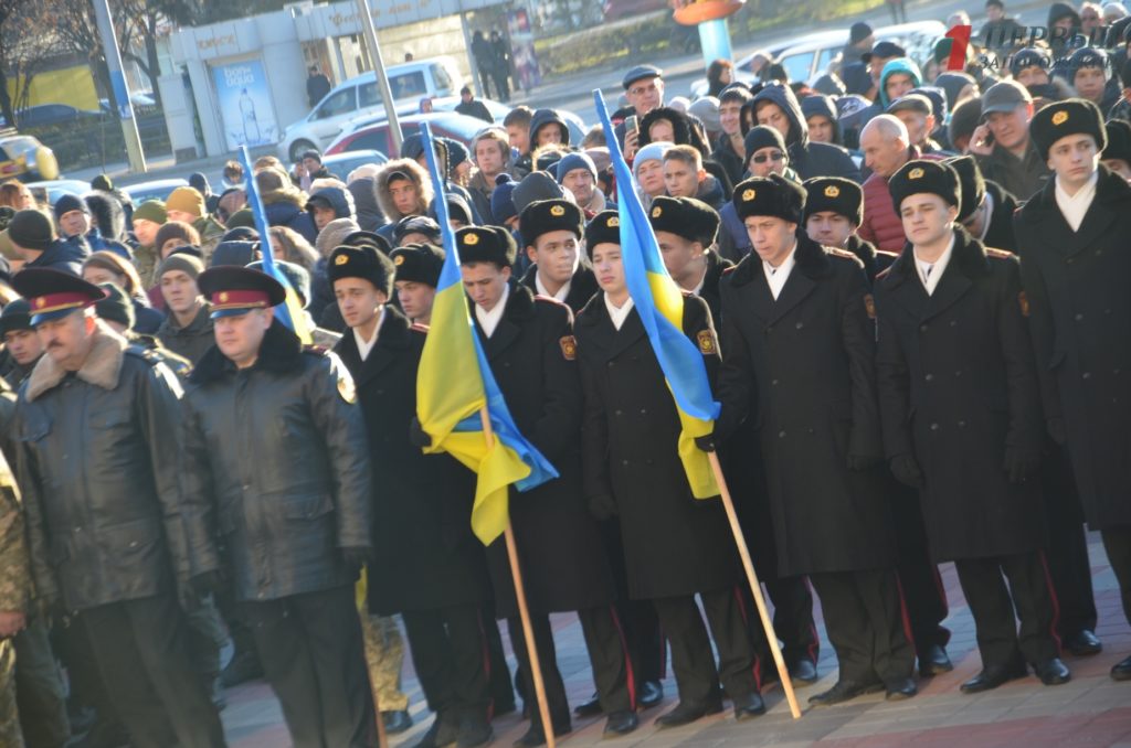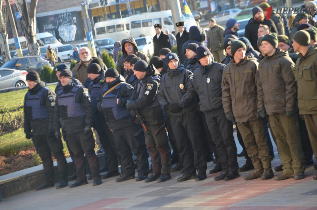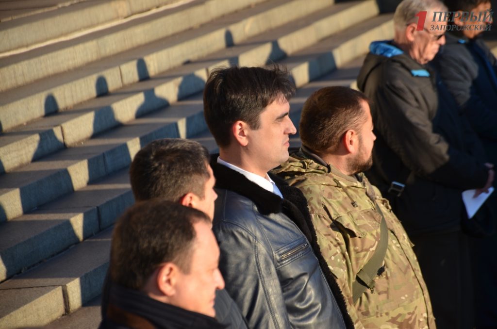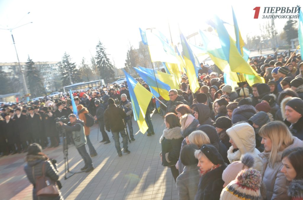 На площади собрались военнослужащие, Нацгвардейцы, ветераны АТО, духовенство, представители областной и городской власти, студенты, общественные активисты и просто неравнодушные жители города и области. Участники акции принесли с собой украинские флаги.