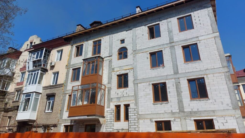 На сегодняшний день подрядчики из компании «Стройинвест» уже полностью построили новую секцию дома и занимаются внутренним обустройством 12 восстановленных внутри квартир. Там уже завершена укладка инженерных сетей и штукатурные работы, поэтому строители готовятся к укладке керамической плитки в санузлах и ванных комнатах. Также в обновленном жилье монтируют систему отопления с радиаторами. На строительной площадке активно работают над утеплением фасада дома.