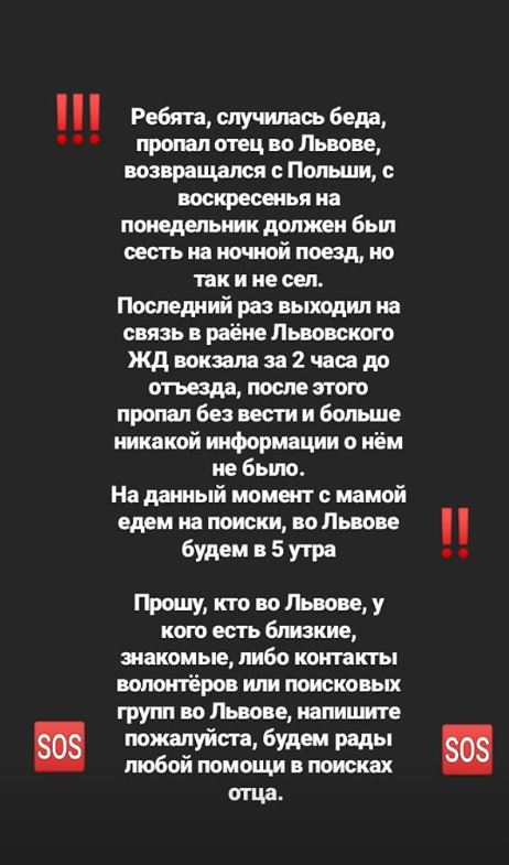 Сейчас сын вместе с матерью отправились во Львов на поиски. Заявление об исчезновении мужчины приняли львовские полицейские, данные об инциденте внесены в базу, рассказал сын.
