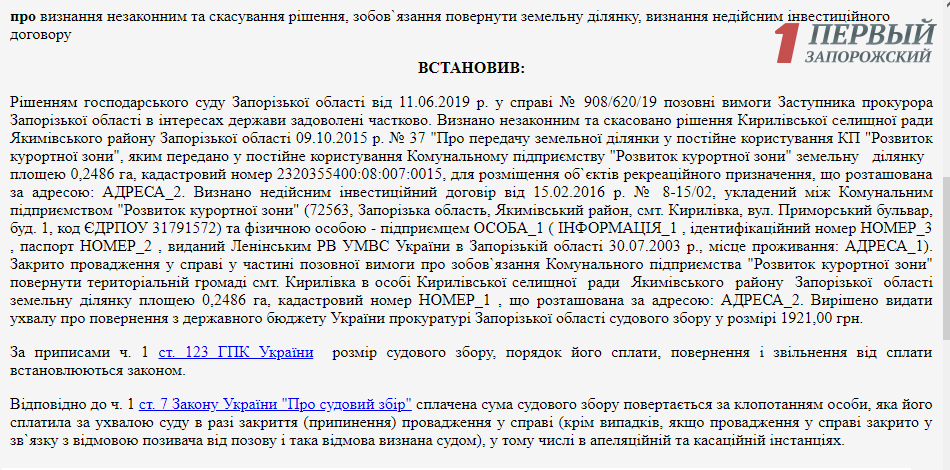 В Запорожье суд отобрал у коммунального предприятия участок земли на берегу Азовского моря
