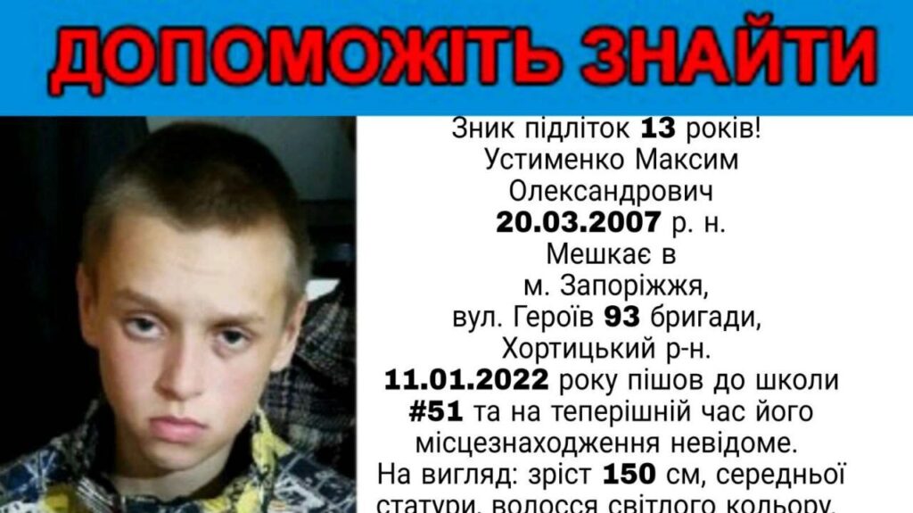 В Запорожье разыскивается Максим Устименко, 2007 года рождения, проживающий по ул. Героев 93 бригады. Об этом сообщает ОО “Поиск пропавших детей”.