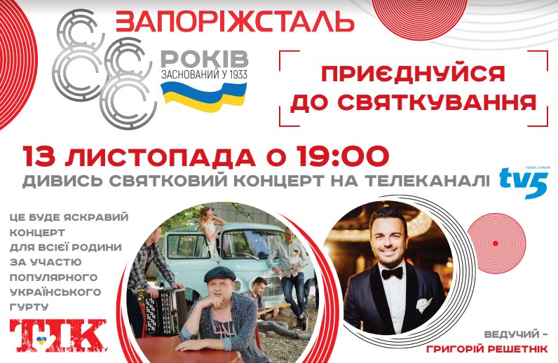 До дня народження одного з найбільших металургійних підприємств Європи, промислового гіганта України – комбінату «Запоріжсталь» в ефірі телеканалу TV5 відбудеться грандіозний концерт за участю зірок української сцени, народних улюбленців, запального гурту ТІК.
