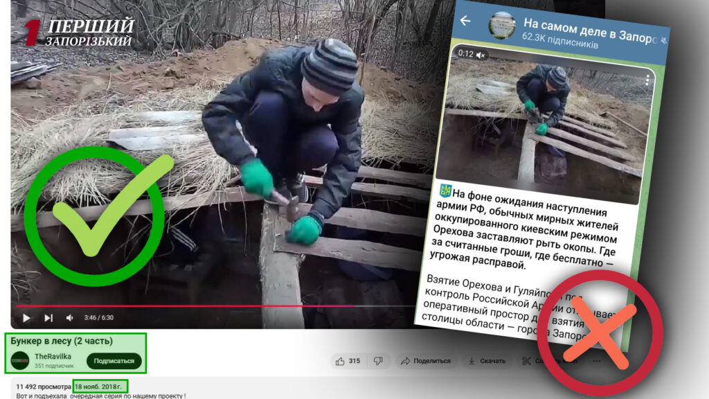 Российские пропагандисты создали видеоролик из несвязанных между собой кадров, найденных в интернете. Например, фото мужчины они взяли из видео, размещенного на платформе YouTube еще в 2018 году, то есть задолго до полномасштабного вторжения. В этом видео российский блогер, автор канала TheRavilka, демонстрирует, как строит бункер в лесу.