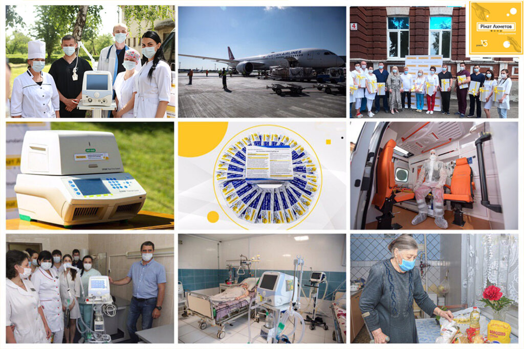 В частности, в прошлом году из КНР в Украину прибыл самолёт с гуманитарным грузом медицинского назначения для помощи украинцам в борьбе с COVID-19. Фонд Рината Ахметова привез партию тест-систем для проверки на коронавирус врачей, работающих в службе скорой помощи. 20 000 диагностических комплектов были распределены между областными центрами экстренной медицинской помощи и медицины катастроф в Черновцах, Ивано-Франковске, Тернополе, Ровно, Виннице, Львове и Житомире.